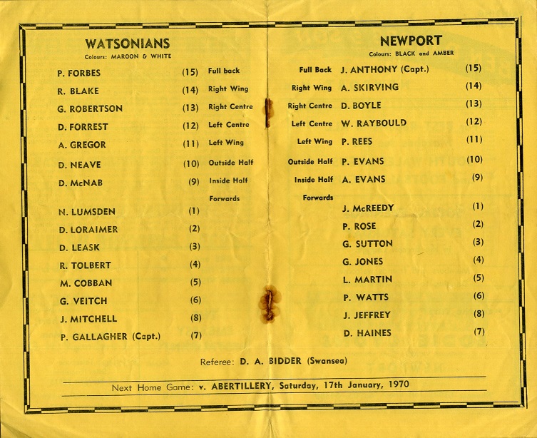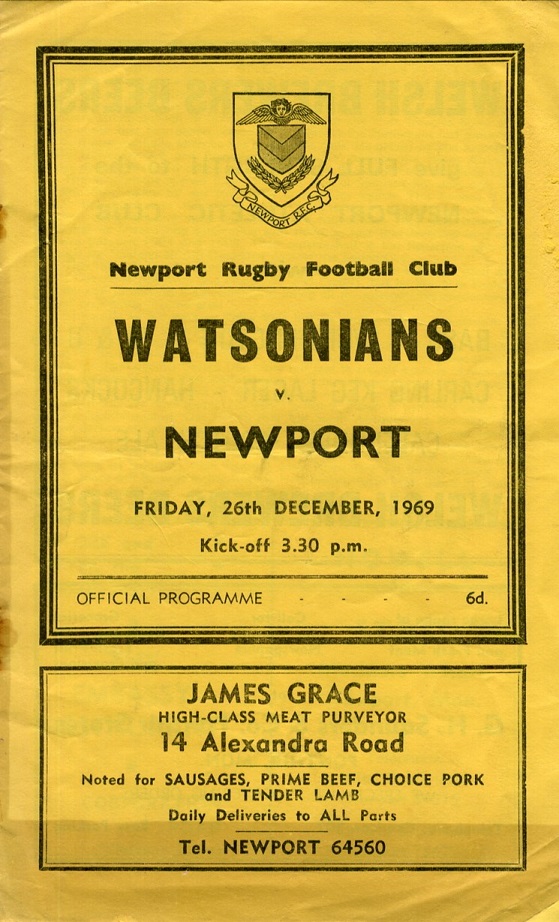 “To-day is our last game in ‘69 so we can review our record to date at the half way mark. We have played 22, won 15, lost 6, drawn 1, with 349 points for and 205 points against. Our victory over the South Africans was the highlight. Our six defeats included four away: to Newbridge, Neath, Gloucester and London Welsh and two on this ground to Cardiff and Llanelli. The drawn game was at the Arms Park. We go into 1970 with away games at Bridgend and Swansea and return home on Saturday, 17th January, when Abertillery will be our visitors.”