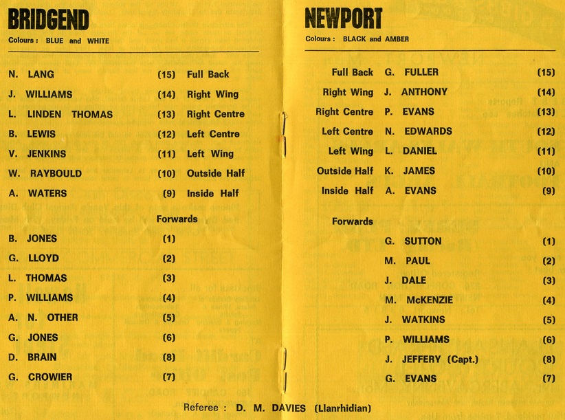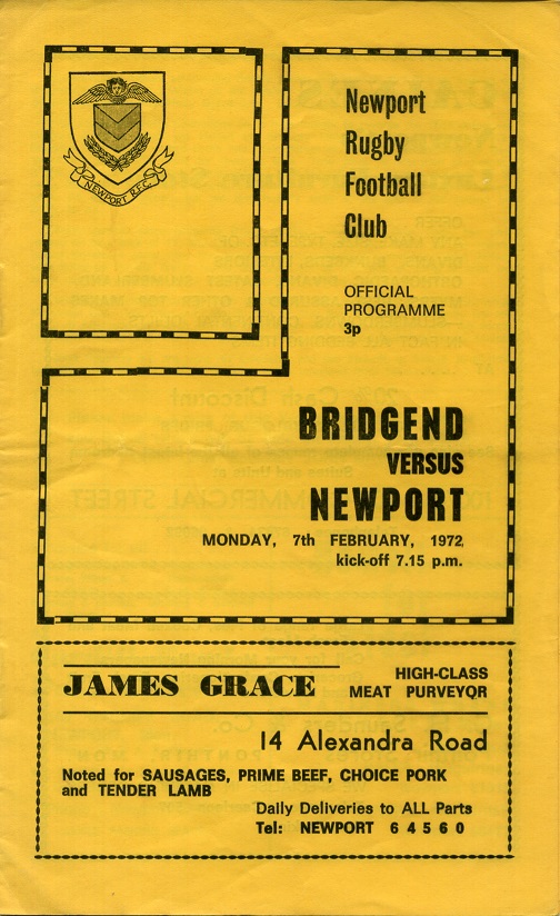 "The attractive Welsh Champions come here tonight to reverse the 17-15 defeat we inflicted on them when we visited the Brewery Field in our first game in 1972. Bridgend have struck a bad patch and their defeat at Swansea last Wednesday was the fourth successive game for them to lose. They have no intention of keeping it this way. John Lloyd has skippered the side for quite a few years and now he is using his talent for leadership with the Welsh XV. Last season we fought a drawn game 8-8 on this ground, but we lost heavily away at the end of the season by 24pts to nil."