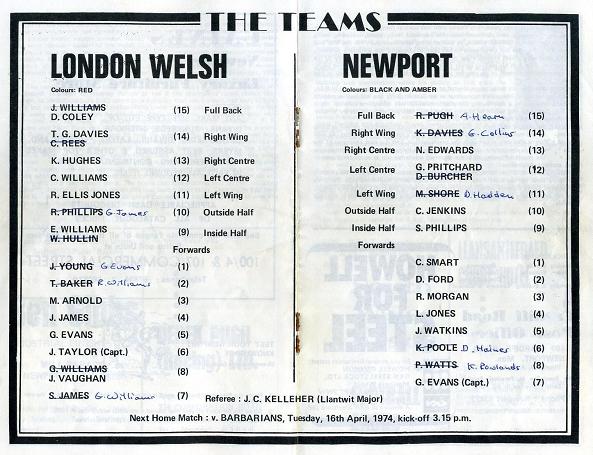 "On checking through their records, it is noted that the wearers of the scarlet jersey with the crest of a red dragon on their left breast, defeated a Ceylon Up Country XV by 108 points to 4 points during their 1972 tour. Although I am certain that this score will not be repeated this afternoon, they will certainly be striving to complete the double having won very convincingly at Old Deer Park earlier in the season. But 'Exiles' beware, for the spirit of Newport has been rekindled by former exile John Ryan."