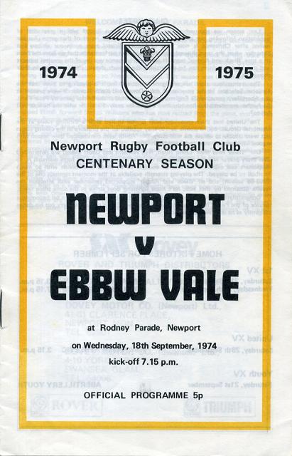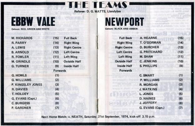 "Their new captain Graham Evans has made over 300 appearances for the 'Vale' and can be expected to lead by example from the flank forward position. Incidentally, Graham holds the club try scoring record for a forward, 19 tries, which he scored during the 1967-68 season, so Newport Beware! This season sees British Lion Arthur Lewis, taking over the coaching duties as well as playing in the centre and it remains to be seen if he can gain as many honours in this capacity as he did as a player. He has already started with his appointment to look after the East Wales XV who played Tonga last Saturday. A familiar face missing in the 'Vale' colours this season is the most capped Welsh forward Denzil Williams who has now retired from the game, everyone at Rodney Parade wishes him all best wishes for the future."