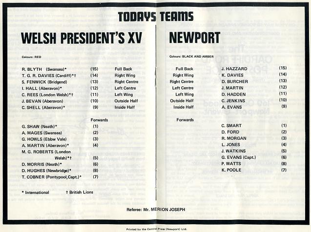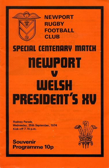 "As one of the founder clubs of the Welsh Rugby Union way back in 1880, Newport Rugby Football Club are delighted this evening to welcome a team representing the President of the Welsh Rugby Union, Mr. H. M. Bowcott, to open our programme of Special Matches to celebrate the Club's Centenary Season."