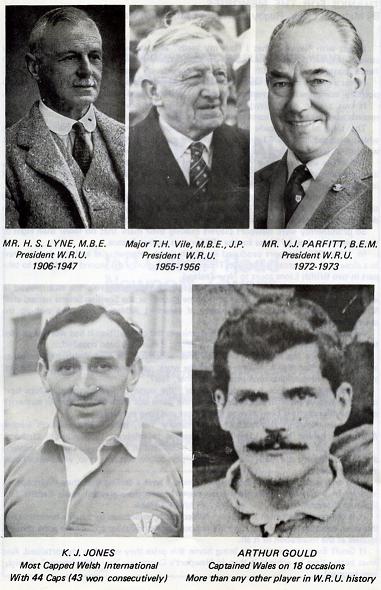 "We at Rodney Parade are very proud of the great contribution the 'Black and Ambers' have made on and off the field over the last ninety-five years in helping make the Welsh Rugby Union the power it is today. Our full contribution can be found on other pages of this programme, but it is worth relating here, that we provided the first Secretary of the W.R.U. in the person of Richard Mullock, also the longest serving President Mr. H. S. Lyne (1906-1947), while K. J. Jones holds the record for appearances in a Welsh jersey (44), and Arthur Gould captained the Welsh side (18) more times than anyone else."