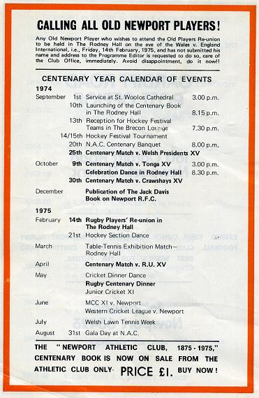 "During the last few seasons Newport have been going through a rebuilding era, which has meant a falling off in standards and the results nowhere near as good as those achieved during the glorious past. But a light is beginning to appear at the end of the dark tunnel thanks to the hard work of many people both on and off the field, and the present team under captain Geoff Evans have the incentive to make this a season to remember in more ways than one."