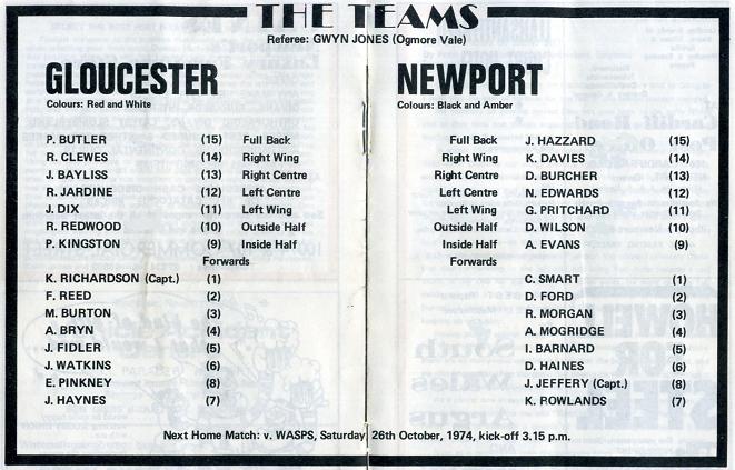 "This season the team are continuing along the same path and new skipper prop forward Keith Richardson, a Master at Wycliffe College, who succeeded hooker Mike Nicholls, is determined that the team will play the same brand of rugby that resulted in over 1,000 points being scored last season. But it is certain that he will also be relying on the prodigious boot of full back Peter Butler, who with over 120 points this season looks set to overtaking the 574 points he amassed last season, which was only 7 points short of Sam Doble's (Moseley) world record. He is determined that an England cap will soon be his, in order that he can emulate Bill Hook and Don Rutherford."