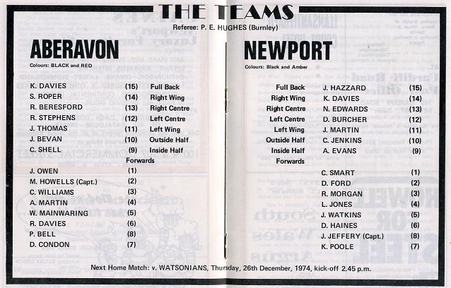 "Today we welcome one of this season's outstanding teams. After failing to win the W.R.U. Challenge Cup in last season's final versus Llanelli, 'the Wizards' have certainly set the 'Port Talbot beacons' alight this season with their fine all-round play. Coach Phil Morgan and skipper Morton Howells have produced a team that has led the Club Championship (until last Saturday) and the Merit Table since the start of the season. Those fine half backs Clive Shell and John Bevan provide the inspiration for the team and it will be interesting to compare them with our own Clive Jenkins and Allan Evans. In the three-quarter line 'Poacher' Condon has been scoring tries from impossible situations, but it is certain that they will miss the experience of Ian Hall who received such a serious injury while playing for Wales versus the 'All Blacks'. It is good to hear that he is on the mend and hoping to play once again. A lesser man than Ian might well have retired, we wish him well and a speedy recovery."