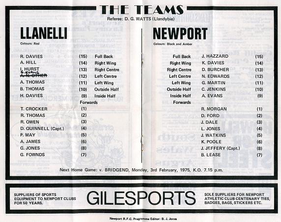 "This season the 'Scarlets' made an inconsistent start, but have recently regained their sparkle and are determined not to sacrifice their position as Wales' top team easily. Such is the strength of the club, this afternoon they decided to field two teams in important fixtures, one here at Rodney Parade, and the other at Amman United where they are playing their third round W.R.U. Challenge Cup game. Supporters at Rodney Parade are very disappointed that many of the famous names are missing but are certain that the fifteen men wearing 'Scarlet' jerseys will provide the brand of rugby expected from Stradey Park these days. On the Friday before the All Blacks v. Barbarians game both teams fought out an interesting 3-all draw in poor conditions at Stradey so there is everything to play for today."
