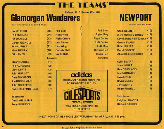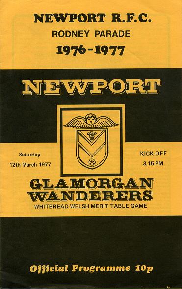 "This afternoon we welcome Glamorgan Wanderers for their second visit to Rodney Parade. They are enjoying a creditable season, the highlight of which was the defeat of Swansea in the W.R.U. Challenge Cup. The 'All Whites' won a great deal of possession during the game but Trevor Evans and his team came up against a defence like the Berlin Wall and returned to St. Helens to await next seasons competition. Following this memorable victory 'the Wanderers' then came up against 'the Pool' and were eventually defeated by the boot of Robin Williams."