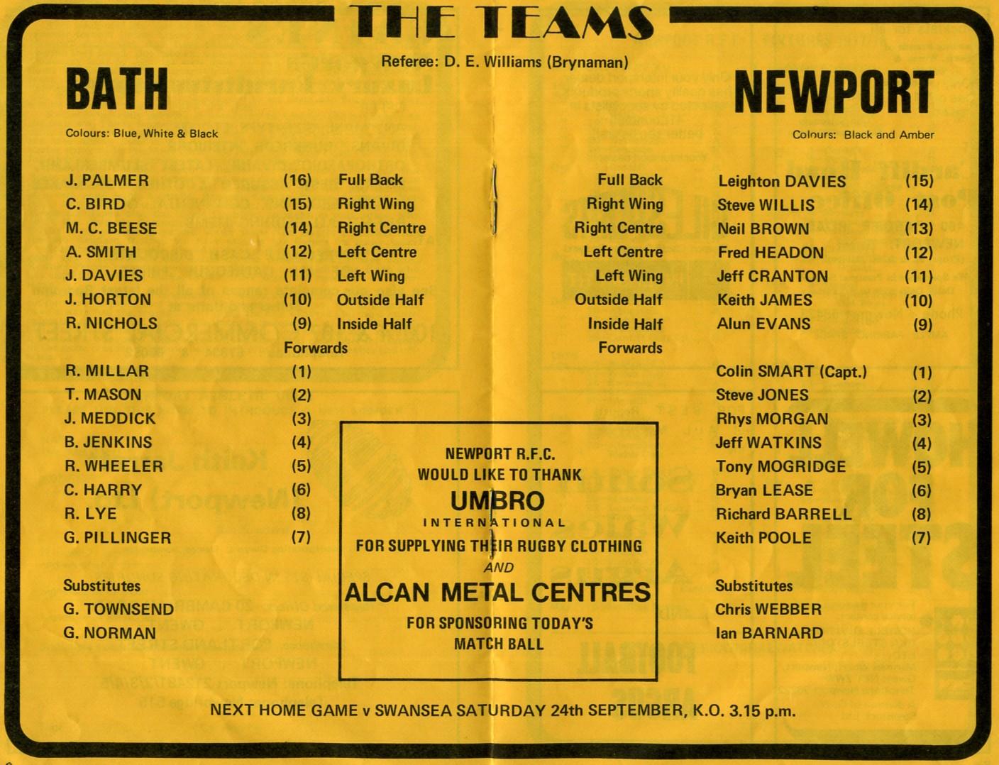 "Welshman John Davies, the clubs record points scorer, who is 'Mr. Versatility' as far as the Bath back division is concerned, showed versus Pontypool, that he is bang in form with the boot by scoring 19 pts., five penalties and two conversions. Let's hope this is a warning to the Black and Ambers not to break the laws of the game. Centres Mike Beese and Andy Smith took their scoring chances well against the 'Pool' to register five tries. Both are strong and powerful and help to form a three quarter line that has a great deal of potential. Secretary Jack Simpkins, Match Official John Roberts and all the other Bath Committee men, will be hoping that the pack can provide enough good ball, for them to operate and achieve that illusive first victory at Rodney Parade."