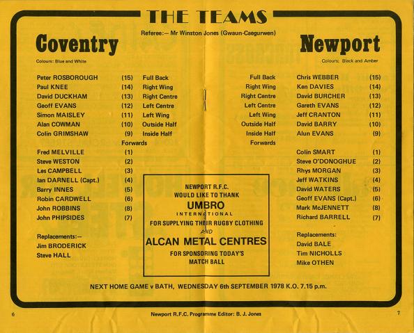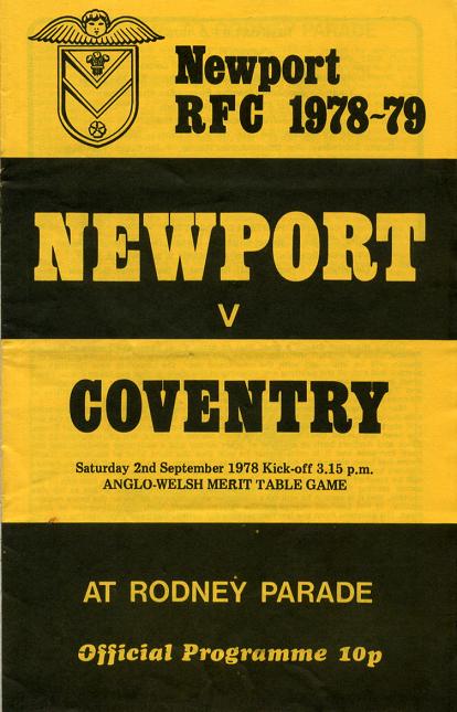 "This afternoon we are delighted to open our 1978-79 season by welcoming Coventry to Rodney Parade, for their first visit since the 19th January, 1968. Due to difficulties over dates when the International matches were on set Saturdays both clubs decided to break off fixtures until it was possible to agree on suitable dates. Last season Newport visited Caundon Road for the first time since the 18th January, 1969, and won a fast exciting game by 21pts to 17pts. The Black and Amber points were scored by Chris Webber 3 PC's, Jeff Cranton, Rhys Morgan and Bryan Lease tries."