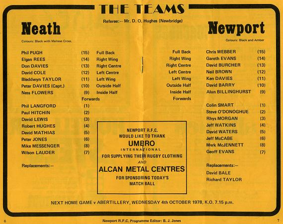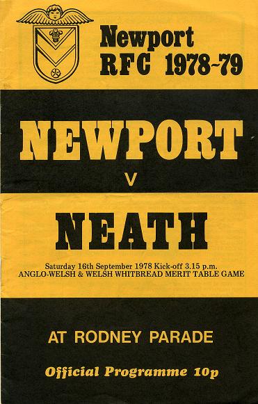 "Last season each team won their respective home fixture, Neath at the Gnoll by 24pts to 10pts and Newport at Rodney Parade, by 18pts to Nil {The night Keith Poole set up the Club Individual Appearance Record). Our two clubs first met in 1878-79, and since then the 144 games have been played, with Newport winning 79, Neath 51 and 12 being Drawn. The last time they won at Rodney Parade was during the 1972-73 season, but it is certain that they would be delighted to return 'West' with a victory this afternoon."