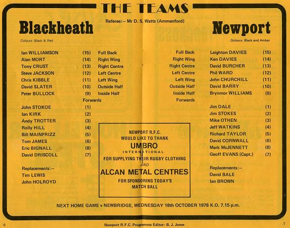 "This season 'The Club' have made an inconsistant start although their 15 - 15 draw with London rivals 'Wasps' last Saturday, must give them encouragement for this afternoons game. Full back Ian Williamson, has once again been showing fine form, while the addition of wing three-quarters Alan Mort, from Richmond will add strength to their attack. Alan, who played in a Black & Amber jersey early in his career would love to be on the winning side this afternoon. Up front 'the Red and Blacks' are certain to cause many problems with their big pack in which John Stokoe, Andy Trotter, Roland Mill and Tom James can be expected to shine."