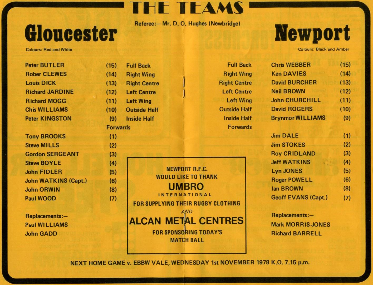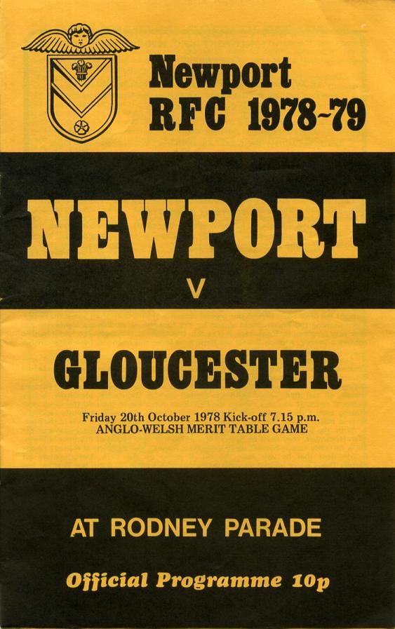 "Tonight is a very special occasion for both clubs for it marks the 100th anniversary of the first meeting between the clubs. This took place at Newport on the 7th December, 1878, when the Black and Ambers, under the captaincy of W. Phillips, were held to a no score draw. Newport won the return fixture on the 15th February, 1879, by one try to nil. Since those days the clubs have met on 166 occasions, with the Black and Ambers winning 110, the Cherry and Whites 41 and 15 being drawn. Last season each club won their home fixture, Gloucester at Kingsholme by 16pts to 6pts, and Newport at Rodney Parade by 17pts to nil. Incidently this game marked Brynmor Williams' debut in a Black and Amber jersey."