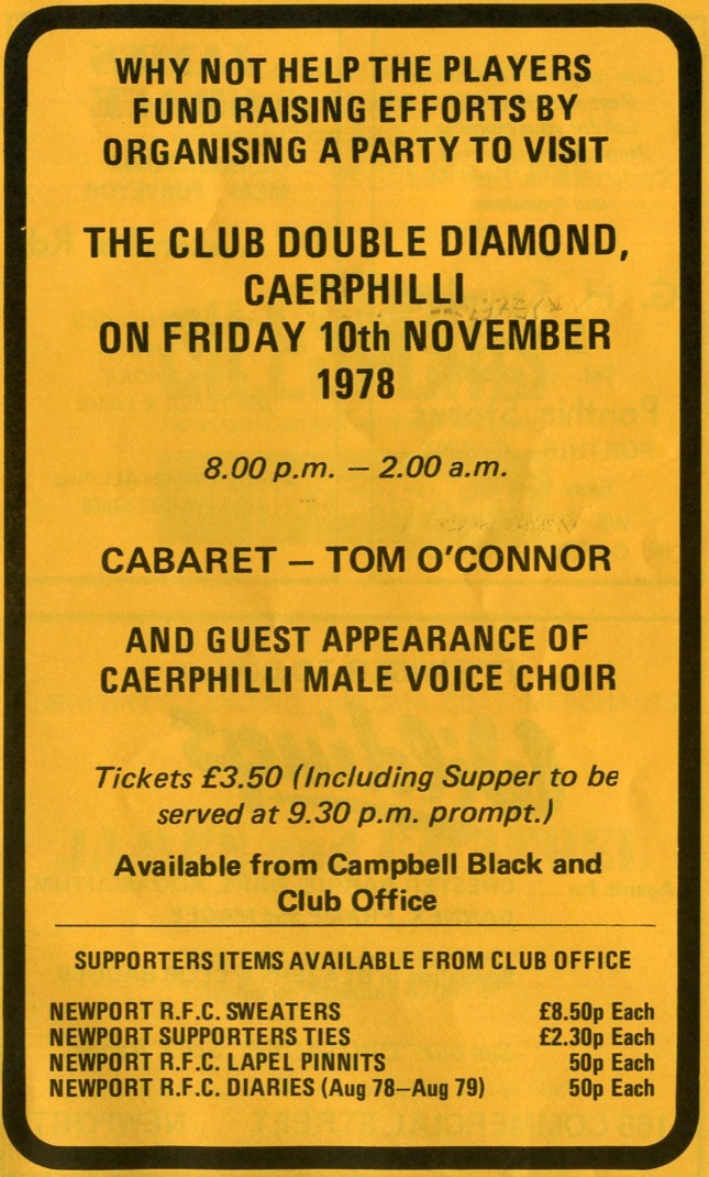 "All our players who turned out for the County at Newport Saracens last Monday evening aquitted themselves well, and provided they escape injury between now and the 29th November, should make the team to play the All Blacks here at Rodney Parade. As this is the last home game of this month, it is an appropriate time to remind you but I am certain there is no need, that the 30th of October, is the fifteenth anniversary of Brian Price's teams historic victory over Wilson Whinerays All Blacks. We extend our best wishes to every member of that team wherever they may be."