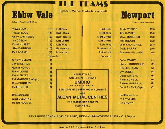 "Former British Lion Arthur Lewis, with the aid of Denzil Williams, another British Lion, and Mike Grindle, form the coaching staff. They have all contributed greatly to Ebbw Vale's illustrious history on the field of play and are putting back into the game many hours coaching young players, Ebbw Vale, are quite rightly proud of the work they are doing, and such talented youngsters as Russell Cole, Ian Gosling, David Hussey Alan Rainbow and Neil Osbourne, will benefit greatly from the vast experience. On the field of play such stalwarts as Gary Lawrence, Neil Collins and Ian Evans, recently returned from Pontypool, ensure that 'the youngsters' are well looked after. Arthur Lewis is also coach to the Monmouthshire County side, who will play the All Blacks, here at Rodney Parade, on Wednesday 29th November. He has seven of his club team in the County Squad, and it is certain that the Red, Green and Whites, will be well represented when the final team is announced."