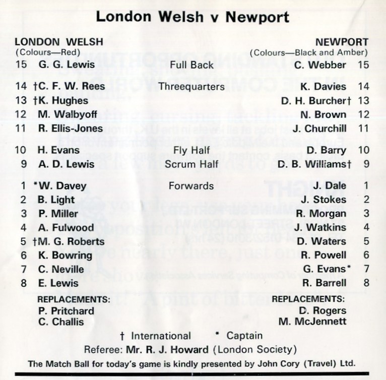 "Our visitors' overall record this season is P18, W10, D1, L7, points for 222, against 181. Leading points scorer is Wales 'B' Cap David Barry with 84 (1T, 19PG, 10C, 1DG), while wing John Churchill leads the try scorers with 7, having scored 3 last Saturday. Former Welsh Youth International flanker Geoff Evans is this season's Captain, having had this honour on three previous occasions. His Vice-Captain British Lion and Welsh International Gareth Evans has unfortunately been out of action for two months with a broken wrist, but hopes to return to action next week. As we go to press we learn that today's half-back combination of David Barry and Brynmor Williams has been selected to play for Gwent against the All Blacks at Rodney Parade on Wednesday next; also in the side is centre David Burcher. Ken Davies and Richard Barrell are replacements. Still going strong at lock is Barbarian and County player Jeff Watkins, who joined Newport in 1967 and has made over 330 first team appearances."