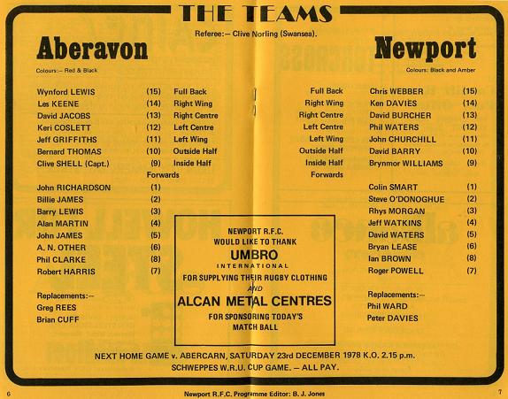 "This afternoon we extend a very warm Rodney Parade welcome to Aberavon. Like ourselves, they are proving very inconsistant this season and have also suffered greatly from injuries to vital players. Last Saturday they were heavily defeated by London Welsh at Old Deer Park, where we had suffered a one point defeat the previous week."