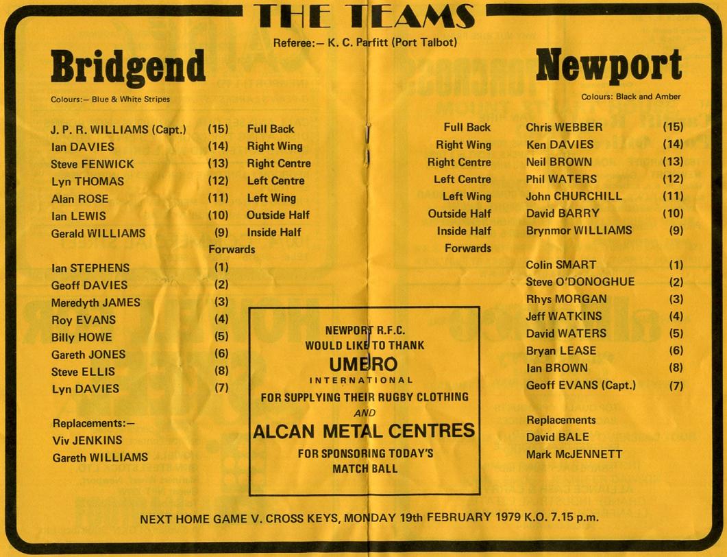 "Everyone at Rodney Parade would like to offer their congratulations to J. P. R. on gaining his 50th cap last Saturday. His contribution to the game has been enormous and he is a household name where ever rugby football is played. Let's hope that he not only leades his club to success during this historic season, but his country to another Triple Crown and Grand Slam (these notes had to be with the printer prior to the Wales v Ireland game)."