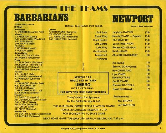 "Rugby followers in Wales are delighted that the Barbarian selectors are continuing their policy in selecting French players and it is certain that if any or all of the three selected, Roland Bertranne, Jacques Fouroux (The Little General) or Jean Pierre-Rives, play this afternoon, they will receive a very special welcome. The same will obviously apply to those Men of Gwent, Eddie Butler and John Doubleday."