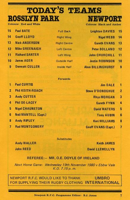 "This afternoon we extend a very warm welcome to Rosslyn Park, who are experiencing a fine season. Formed in 1879, 'the Park' celebrated their Centenary last year under the captaincy of Keith Roach and achieved the following record: P39 W26 D2 Lll For 720 A389. Included in that record is the heaviest defeat ever inflicted on Newport by 'the Park', when they won at Roehampton by 28 pts. to Nil. The club were obviously hoping to mark their Centenary by winning the John Player Cup but, unfortunately, although their semi-final versus London Irish ended in a 6 all draw, the Exiles went through to the final as 'the away side'."