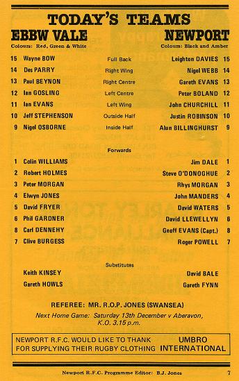 "When at full strength, Ebbw Vale are a well balanced side with the skipper and his co-centre, Ian Goslin, providing plenty of chances for Des Parry and Wayne Bow, while the return of Nigel Osborne from Pontypool has added a new dimension to their play. Up front the two stalwarts, plus the ageless Gareth Howls, Robert Holmes, Colin Williams, Elwyn Jones and David Fryer, ensure the best traditions of the Red, Green and Whites are maintained."