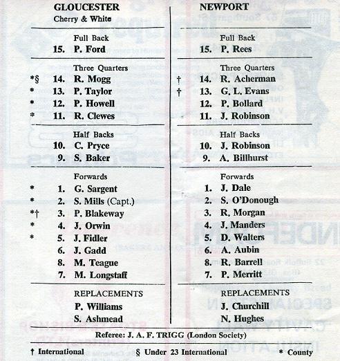 "Last Season, our first game, at Kingsholm, resulted in a worthwhile 31-12 win for Gloucester. Steve Baker, Alan Brooks and Paul Wood all scored tries, while Brian Russeli chipped in with a drop goal. Peter Butler added another drop goal, converted two of the tries and kicked three penalties."