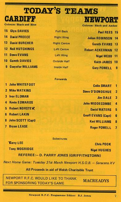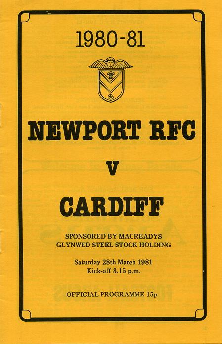 "This afternoon we extend a very warm Rodney Parade welcome to our near neighbours from the other end of the Newport Road, 'the old enemy' Cardiff, fresh - if anyone can be fresh after playing rugby in such appalling weather conditions - from their titanic victory over Swansea in the semi final of the Schweppes W.R.U. Challenge Cup at Bridgend last Tuesday evening. We offer them our congratulations and are confident that the Final versus Bridgend at the National Stadium on Saturday, 11th April, will be a memorable occasion as both teams strive to carry off the coveted trophy in the W.R.U's Centenary Year."