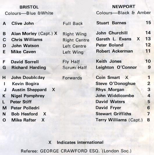"Early indications of form this season were Newport's defeat by Coventry 21-10 last Saturday whilst Bristol won 18-16 at Northampton in spite of missing all their kicks but one! At the time of going to press the Cardiff result is not available, but it is worth remembering that whilst Bristol beat Cardiff last September, Cardiff improved to lay claim to being the best Welsh Club side by the end of the season, beating Bristol at the Arms Park and winning the Welsh Cup. On the same night Newport play Bath so the results of both those matches, together with todays game, should provide a very interesting pointer to early season form."