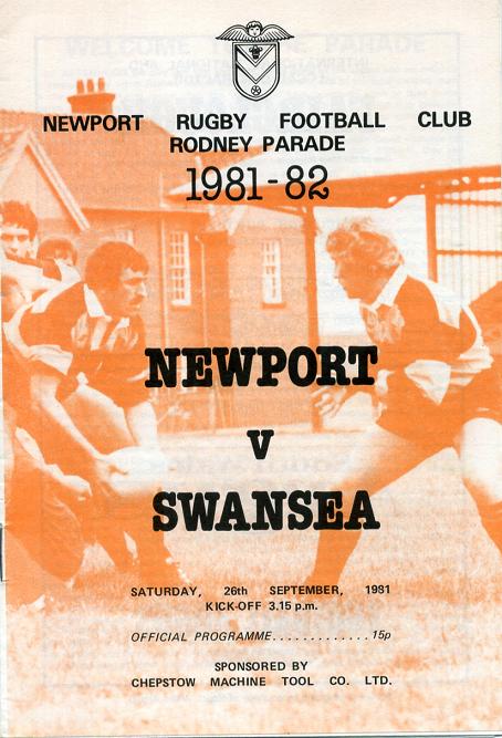 "THIS AFTERNOON we play our first Saturday home game of the season and are delighted to extend a very warm Rodney Parade welcome to Swansea, one of the most exciting teams in the country. During recent years the 'All Whites' have recaptured some of their former glories by winning the Whitbread Welsh Merit Table, the W.R.U. Challenge Cup (defeating Newport 13 - 9 in the final) and the unofficial Club Championship, after spending many years in the wilderness. A great deal of work has taken place at St. Helens over many years to produce the highly respected squad of players newly-elected captain David Richards has under his control. But he is confident that in harness with coach Stan Addicott, they will be able to produce continued success into the 80's."