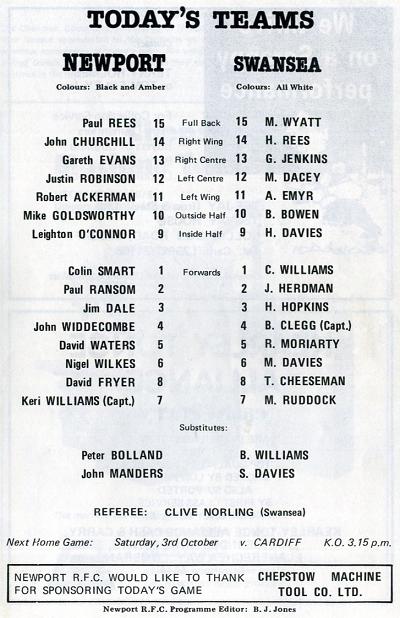 "Any squad of players containing such names as Roger Blyth, Mark Wyatt, Tony Swift, David Richards, Gareth Jenkins, Alan Donovan, Alan Meredith, Malcolm Dacey, Brynmor Williams, Huw Davies, Clive Williams, Jeff Herdman, Barry Clegg, Geoff Wheel, Richard Moriarty, Gareth Williams, Mark Keyworth, Trevor Cheeseman, Hywel Hopkins, Gareth Roberts and Keith Williams, must be capable of producing running rugby of the highest calibre and no doubt our near neighbours, Cross Kevs, will confirm this. Last season the 'All Whites' achieved 'the double' over Newport, winning 23 - 3 at St. Helens and 9 - 7 here at Rodney Parade, and one has to go back eight games to the 24th September, 1977, to record the Black and Ambers last victory, when we won here at Rodney Parade by 16 pts. to 13 pts. But Swansea are well aware that they went through a very lean period here at Rodney Parade and that victories are never easy to obtain over the Black and Ambers."