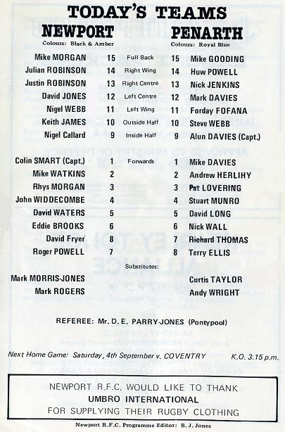 "Penarth have not beaten Newport since 7th September, 1957, which was one of their 6 victories achieved here at Rodney Parade, but it is certain that they will be giving everything to make a memorable start to the 1982-83 season."