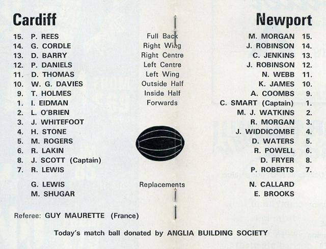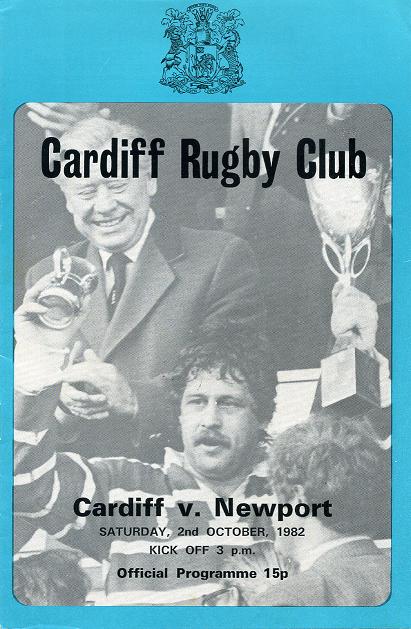 "Back to this afternoon, however, we offer our most cordial greetings to our oldest and by far the most played of our adversaries Newport. Today's game will mark the 345th time we have met since the year of our formation, 1876. The record of the previous 344 shows 162 wins to us 125 to Newport and 57 ending in stalemate. The stories behind these statistics, however, are quite legendary and one of the milestones the Black and Ambers would dearly like to have achieved was 4 wins in a season against us. From season 1887-88 up until 1975-76 the sides met regularly 4 times per season and as already stated Newport have never managed to win all 4 in any one season but we have managed that accolade on 4 occasions in seasons 1897-98, 1905-06, 1947-48 and finally 1951-52. Mind you Newport have been very near it on several occasions and many a past Cardiff captain has sweated blood knowing that he might be the man to surrender the record to the Usksiders but after many narrow escapes we have held out. Perhaps the most hair-raising game was experienced by Howard Norris' side of 1968-69 when we had lost on the previous 3 occasions and Brian Price brought his all talented side to the Arms Park determined to achieve their life long ambition. It was very much of a heart stopping with the scores level at 9 all some 15 minutes into the second half. The Black and Amber from there on in really put the pressure on and were camped in our half almost permanently but victory and that elusive 4 timer was to be denied them and the game finished at 9 all. Never was a final whistle such sweet music to us but a dirge to Newport. Since 1976-77, however, fixtures have been reduced to 2 so perhaps Newport took some consolation for never achieving the elusive white wash by beating us in the Cup in our centenary year by the narrowest of margins 16-15."