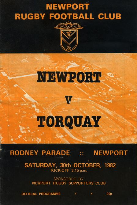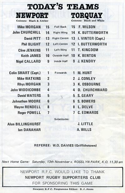 "Our two Clubs have met on 8 previous occasions, with Newport winning 6 games, Torquay 1 and 1 game being drawn - the last occasion being during the 1980-81 season when the Black and Ambers won here at Rodney Parade and scored a half century of points. One person who will be hoping for an improvement today will be ex-Newport prop David Jones (a member of the 1963 team who defeated the All Blacks) who, after coaching the Club for a number of years, is now Chairman of Selectors."