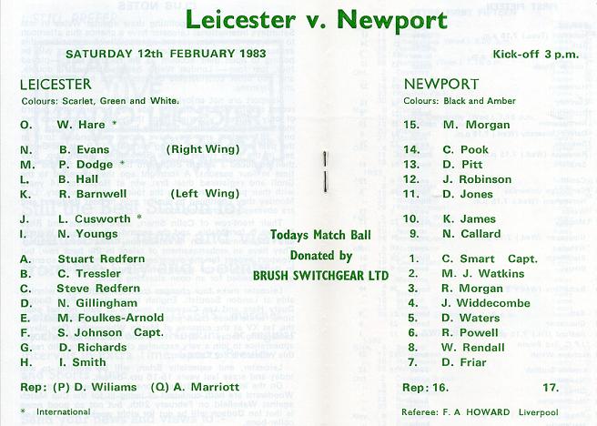 "Leicester make four changes from last Saturday's winning side at London Scottish. English Internationals Paul Dodge, Dusty Hare and Les Cusworth resume in their normal positions, while loose head prop Stuart Redfern gets back into the 1st XV at the expense of Martin Whitcombe. One player celebrating today is Brian Hall who notches up his 300th appearance to join a very exclusive club of players who reach this milestone for Leicester."