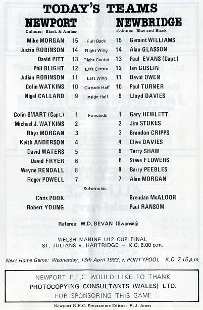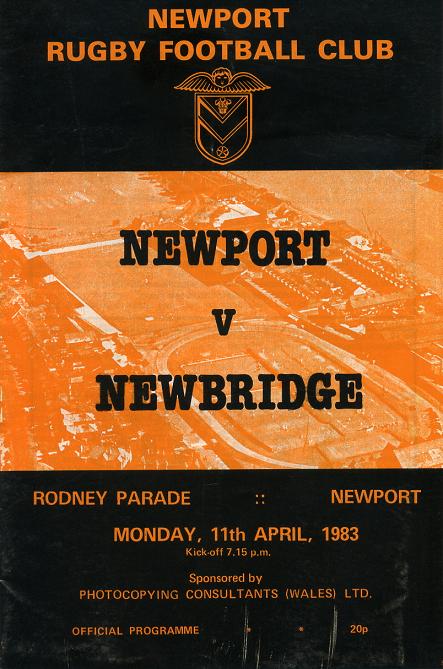 "Last season both Clubs won their 'Home' game, the scores being 16-14 and 10-3 so, with our visit to the Welfare Ground on Saturday, 23rd April 1983 due to be televised on B.B.C. Wales Sports Line Up, tonight's game will be closely contested. Welcome, Newbridge."