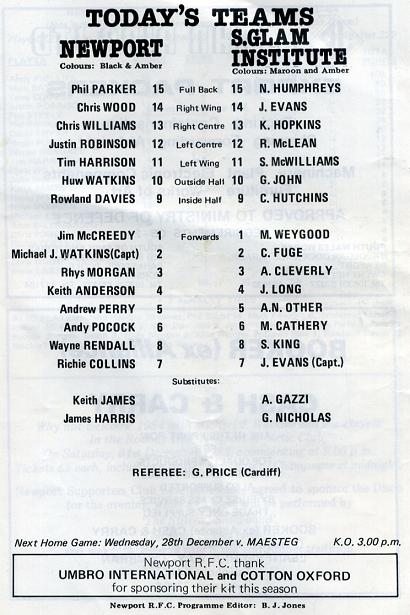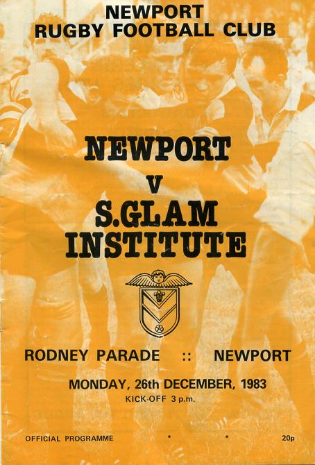 "This afternoon's visitors to Rodney Parade first appeared on a Newport fixture list on Boxing Day 1977, when the Black and Ambers defeated the then Cardiff Training College by 47pts to 10pts. Since changing their name to South Glamorgan Institute, they have played here on three occasions, the first being on New Year's Day 1980, when they achieved an historic victory by 20pts to 6pts, the second on 30th January 1982, when they were defeated by 24pts to 7pts in the 3rd Round of the W.R.U. Challenge Cup, and Boxing Day 1982, when the Black and Ambers won by 53pts to 13pts, with a certain Stuart Barnes scoring 25pts and Tony Coombs getting a hat trick of tries."