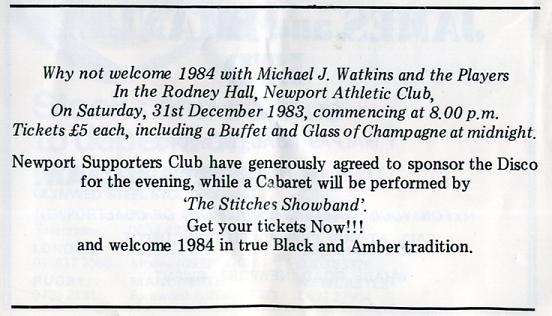 "Our fine cup victory over Ammanford, when the whole team demonstrated all the finest skills of attacking rugby, were amply rewarded in the draw for the 3rd Round of the Schweppes W.R.U. Challenge Cup with another home game. Our opponents on 28th January 1984 will be South Glamorgan Institute, and it is certain that they will be keeping a check on our strengths and weaknesses this afternoon through the eye of their very knowledgeable coach, Leighton Davies. They will need no reminding that our two clubs met at the same stage in the 1981-82 competition, with the Black and Ambers winning by 24pts to 7pts."