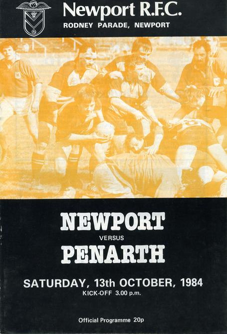 "This afternoon we extend a Rodney Parade Welcome to our friends from "Donkey Island" who first appeared on a Newport Fixture List 98 years ago when they were defeated here by 5 goals and 7 tries to nil. This season Penarth have had a traumatic start, suffering heavy defeats on numerous occasions and being eliminated from this season's W.R.U. Schweppes Challenge Cup in the first round by Taffs Well. They are obviously suffering greatly by the loss of two players, namely, Roddy Crane to Pontypridd and Peter Goodfellow to Newbridge who were vital members of last season's team who achieved some excellent victories. Last season we achieved a "double" over Penarth winning at "Donkey Island" by 26 points to 3 and here at Rodney Parade by 42 points to 10. It is interesting to note that in the game at Rodney Parade the Black and Ambers, in scoring 8 tries, broke the Club try scoring record for a season, while their 42 points ensured that the accumulative points record for the Club in a season was also passed."