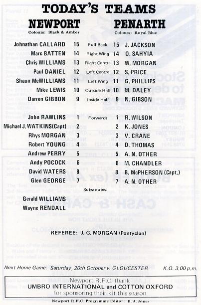 "This afternoon, the Black and Ambers contain three players who are making their 1st XV debuts, in the persons of wing-threequarter Shaun McWilliam, inside-half Darren Gibbon and flanker Glen George. These three players have previously played for the United XV and Newport Representative XV's, showing considerable promise, and it is certain that they will take the opportunity of staking a claim for a permanent 1st XV berth in the future and we wish them well in their quest. Darren, who will be remembered for his exciting runs as a wing-threequarter substitute in our victory over Bristol, will be playing in his No.1 position of scrum-half. The Selectors are using today's game to experiment with Wales Squad lock-forward, David Waters, in the No.8 position and although the vast majority of his 327 1st XV games have been in the lock position, he has played No.8 on isolated occasions, particularly on tour in South Africa and Portugal."
