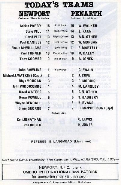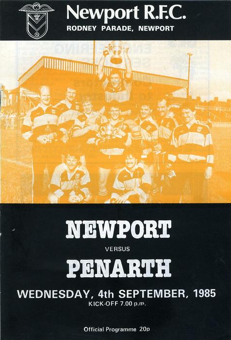"This evening we open our Rodney Parade season by extending a very warm welcome to our friends from 'Donkey Island', Penarth. For many years they were our traditional opening opponents here at Rodney Parade and will be anxious to wipe out the memory of last season's visit when their defeat by 98pts to Nil gave us our highest victory since our inauguration. During the close season, officials at the Athletic Ground have worked tremendously hard to renovate the Club and everyone in Welsh rugby hopes their efforts will be rewarded."