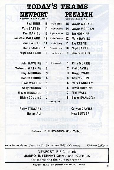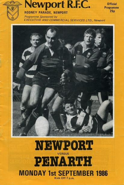"This evening we welcome Penarth to open the 1986-87 season, here at Rodney Parade. "Donkey Island" as our visitors are affectionately known as in the rugby world, opened our seasons for many years and the Black and Amber faithfuls were delighted, as were many other people in the rugby world, with the fine improvement they made last season under captain Rob McPherson. Re elected for this seaspn Rob has recently returned from his honeymoon and we wish him well in his duties both on and off the field. One player Penarth will miss this season is the fine South African No8 Rudi Streuli, who made a tremendous impact during his short stay at "Donkey Island". Penarth in an endeavour to maintain their improvement, have appointed Brian Joseph as "Team Manager" to work in close association with the captain. Everyone at Rodney Parade wishes them every success and are certain that their efforts and those of the other Committee Men and Players at the Athletic Ground will achieve just rewards."