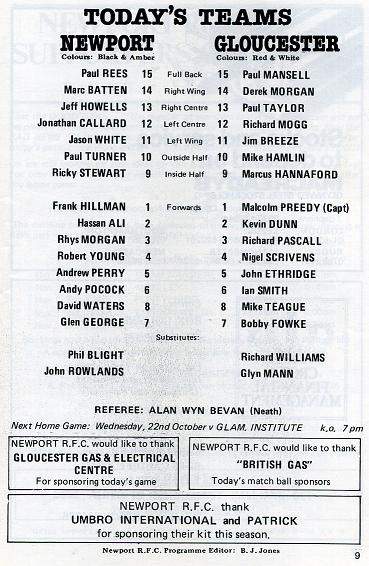 "THIS AFTERNOON we extend a very warm welcome to our friends from just over the border, Gloucester. The Cherry and Whites have already encountered Gwent opposition twice this season and suffered defeat on both occasions. They were defeated at Pontypool Park earlier this month, while on Wednesday evening Ebbw Vale travelled to Kingsholme and returned home with a 9-7 victory. Following their success of last season, Gloucester were hoping that this season would see the team to the forefront of Anglo-Welsh Club rugby. Unfortunately, due to a variety of reasons, Malcolm Preedy, the England international who captains the Cherry and Whites, and his team have been unable to sustain any kind of consistency. They have played 13 games and only won 4, although the Black and Ambers should be aware that Swansea only escaped defeat at Kingsholme through the home club missing several kickable penalties. Scrum half Marcus Hannaford is included in the England squad who will travel to Portugal in a few weeks' time. He will be hoping that his captain and fellow England international No.8 Mike Teague will provide enough ball with their fellow forwards for him to demonstrate his skills this afternoon. Another talented player in the person of England 'B' wing Richard Mogg will be looking for try scoring opportunities. Former outside half Bob Redwood is the current Club Coach and together with former Gloucester stalwarts Peter Ford, Micky Booth, Mike Nicholls, Jim Jarrett and Alan Brinn, current Committee-men, will no doubt inform today's Cherry and Whites that they last achieved a victory over the Black and Ambers on 17th October 1981 (19-Nil), while the records show that the last time they won here at Rodney Parade was on 20th October 1978 (16-9)."