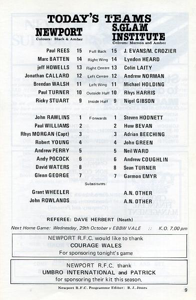 "The injury list has been shortened during the last fortnight and captain "MJW", coaches Tony Faulkner and Roy Duggan and their fellow selectors are hopeful that they will soon have a full complement of players to select from. They are confident that a first choice Black and Amber team will be a major force in Welsh rugby. The message is, "Get Well Soon," to "MJW", Paul Daniel, Shaun McWilliam, Nigel Callard, John Rawlins, Wayne Rendall and Roger Powell."