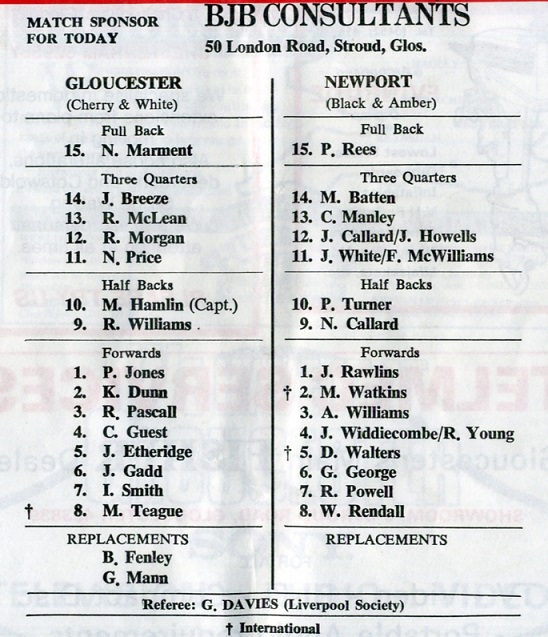 "There isn’t any doubt that our long-standing fixtures against the Black-and-Ambers provide some of the toughest challenges the lads get. But there rarely seems to be that much between the two clubs in the final analysis. Certainly, they gave us a 34-21 beating at Newport last October, but results since 1983 read (Gloucester scores first), 3-7, and 10-12 with the rest being lost to the weather."