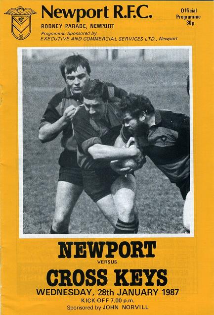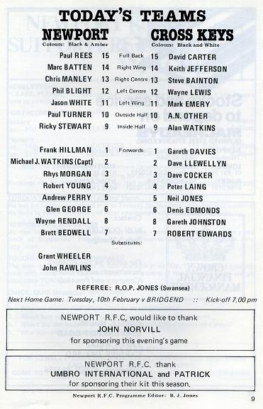 "THIS EVENING we extend a very warm Rodney Parade welcome to our near-neighbours from the Western Valley, Cross Keys. The Black and Whites are going through a traumatic season following their Centenary celebrations last season, and there would have been many smiles at Pandy Park last Saturday when their win over North Wales Club Wrexham ended nine consecutive defeats. The victory was achieved at the cost of two players who may be sidelined for a few weeks in the persons of Stuart Havard and Simon Hopkin. The "Keys" selectors certainly believe that "it never rains, unless it pours"."