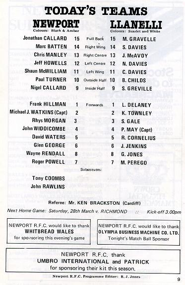"THIS EVENING we extend a very warm welcome to our friends from Stradey Park who arrive chasing "the double", having comprehensively defeated us earlier in the season by 35pts to 7pts. The only satisfaction that Black and Amber followers achieved from that "debacle" is that 'MJW' and his team have only lost once since, and that was that never-to-be-forgotten cup game at Cardiff. Captain Phil May and his team will be very conscious of the fact that Newport have won their last 17 Club matches and that the Scarlets last won here at Rodney Parade on 31st October 1981 (10-9). He, like all Black and Amber followers, will also be aware that the selection of David Pickering and Ieuan Evans to play, and Andrew Buchanan and Jonathan Griffiths as substitutes for Wales next Saturday at Murrayfield, coupled with the loss of Phil Davies through injury, will severely deplete his team. But it is certain that Tony Faulkner and Roy Duggan will not allow this situation to create any complacency in the Black and Amber ranks, for the Scarlets have a great reputation of rising to the occasion and there are many fine players still available for selection from their strong squad."