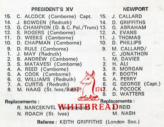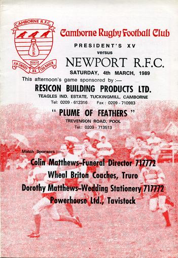 "This afternoon we have great pleasure in welcoming the players and officials of Newport R.F.C. on their first, but we hope not last, visit to the Recreation Ground. We are particularly grateful that our visitors agreed this fixture at such short notice as a result of Abertillery being unable to honour the original fixture due to their Welsh Cup committments. Newport R.F.C. are very welcome in their own right as a famous Welsh Club whom we have long hoped would visit. We hope that they will enjoy their short visit to the Duchy."