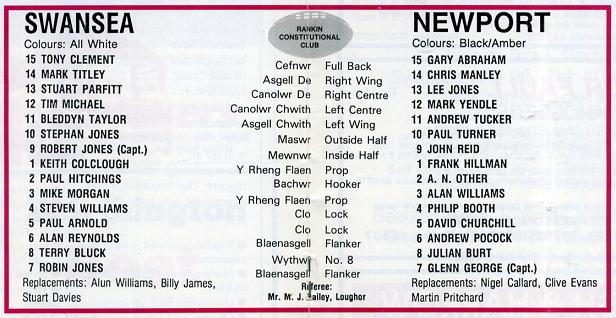 "Todays visitors are Newport - old friends and adversaries; who have recently improved their performances, after a poor start to the season. The experience of Messrs. Stuart Watkins, Gareth Evans, Brian Price and David Watkins, who have been assisting the club recently, will surely help regain the prestige position previously enjoyed by the Black and Ambers."