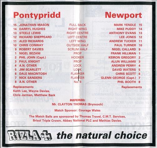 "When we come to consider Newport, I suppose the real mystery is not why it is that they are suddenly beating all and sundry, but how it is that they ever got in to such a depressed situation previously. The whole thing beggars description. Here was one of the great clubs in the land, one of the big four if you like, with everything going for them, and suddenly it all seemed to evaporate like morning mist, I suppose the analysts, if they dug back far enough, would come to a single moment or event, a singularity as Einstein would say, where they could state that here was the turning point in Newport's fortunes. Whatever that event was, even the most pessimistic of Newport supporters could have supposed, for one moment, that it would lead to a period of unparalleled mourning in the history of the Club. How the great names of the past would revolve in their tombs at the thought of teams travelling to Rodney Parade fully expecting to win! And this is how it has been, apart from one or two false dawns, for years now. There is a solidity and a realism about Newport's latest resurrection, however that proclaims that this is the real thing, and that the good times everlastingly around the corner are at last coming into view. Anyone who beats Llanelli and Cardiff within a couple of days can surely be entitled to regard themselves as up-and-coming, at the very least! A few months ago we would have regarded tonight's encounter as a banker win - now Newport, breathing fire, are looking to underline their recent run of success. It should be quite an encounter!"