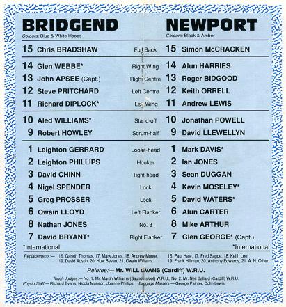"For BRIDGEND, there are 10 changes from the side which won at Abertillery by 10 points to 4 a week last night. Remaining in the side are CHRIS BRADSHAW, LEIGHTON PHILLIPS, NIGEL SPENDER, GREG PROSSER and OWAIN LLOYD."