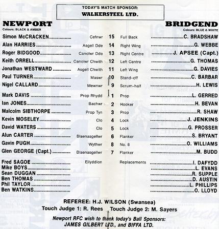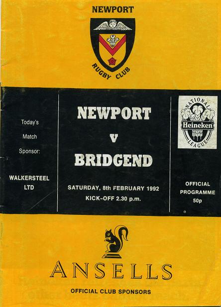 2Bridgend take the field at Rodney Parade this afternoon with a record of five victories from the eight Heineken League matches they have played so far this season. Their victims include Llanelli, Cardiff, and, of course, Newport in their first league match of the campaign. Their success against Newport at the Brewery Field was limited to a five points margin in a closely contested game, but they will be eager to prove that their narrow 12-7 victory in no way flattered them!"